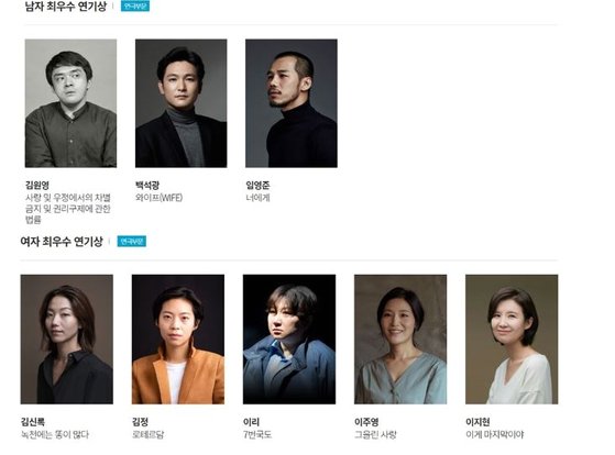 남녀최우수연기상 후보는 전원 참석이다. 남자최우수연기상 후보 '사랑 및 우정에서의 차별금지 및 권리구제에 관한 법률' 김원영 '와이프' 백석광 '너에게' 임영준, 여자최우수연기상 후보 '녹천에는 똥이 많다' 김신록 '로테르담' 김정 '7번국도' 이리 '그을린 사랑' 이주영 '이게 마지막이야' 이지현이 한 자리에서 선의의 경쟁을 펼친다.