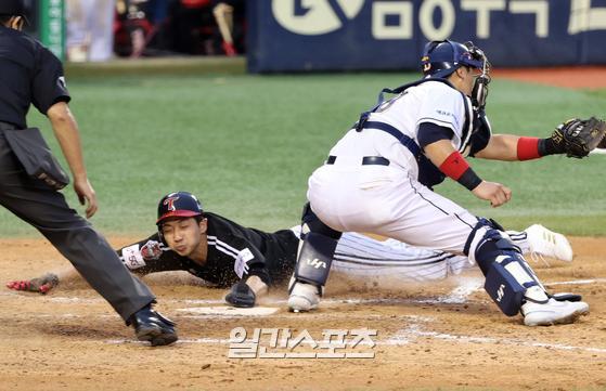 2020프로야구 KBO리그 두산베어스와 LG트윈스의 경기가 26일 오후 잠실야구장에서 열렸다. 7회초 1사 1,3루 유강남의 역전 2타점 적시타 때 1루주자 김용의가 홈까지 뛰어 세이프하고 있다. 잠실=김민규 기자 LG가 과감하게, 또 신나게 달린다. 정확한 판단과 빠른 발, 재치 있는 슬라이딩까지 주루 3박자가 딱 맞아 떨어진다. LG는 지난 26일 4-3으로 승리, 두산을 상대로 469일 만에 우세 시리즈를 거뒀다.