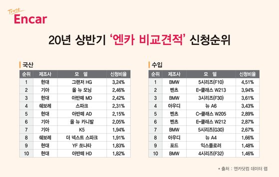 엔카닷컴은 내차팔기 서비스 ‘엔카 비교견적‘의 상반기 신청 건수를 조사한 결과 국산차는 현대 그랜저 HG, 수입차는 BMW 5시리즈(F10)가 가장 많았다고 21일 밝혔다.