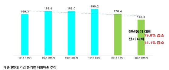 국내 100대 기업 해외수출 추이. 코로나19 여파로 올해 2분기 국내 100대 기업의 해외매출이 20% 급감한 것으로 나타났다.