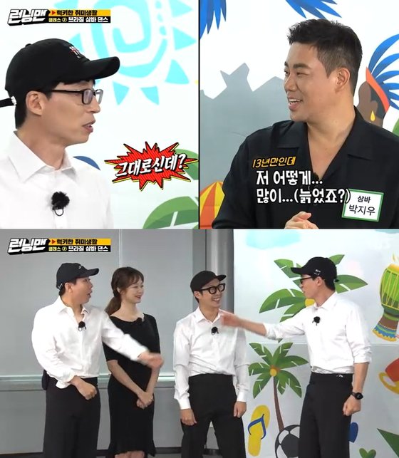 유재석은 13일 오후 방송된 SBS 예능프로그램 '런닝맨'에서 멤버들과 브라질 삼바 댄스를 배우기 위해 전문가들과 만났다. 그러던 중 13년 만에 본 댄스 스포츠 선수 박지우에 반가움을 표했다.