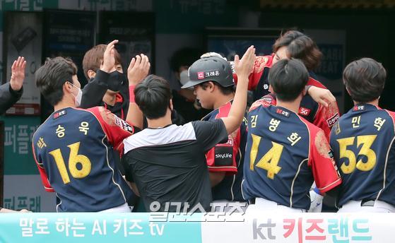 프로야구 KT와 LG의 경기가 4일 오후 수원 KT위즈파크에서 열렸다. KT 강백호가 6회말 우월 1점 홈런을 날리고 동료들과 기뻐 하고있다. 수원=정시종 기자 강백호는 키움 이정후(22)와 함께 장차 한국 야구를 이끌어갈 타자로 손꼽힌다. 강백호는 타고난 힘에 빠른 스윙 스피드를 자랑한다. 데뷔 3년 차인 올해 4일까지 타율 3할대 타율에 20홈런, 73타점을 기록하고 있다.