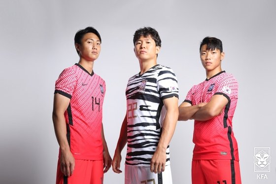 축구대표팀 새 유니폼을 입은 백승호, 권창훈, 황희찬(왼쪽부터). [사진 대한축구협회] 파울루 벤투(포르투갈) 감독이 이끄는 한국축구대표팀이 국제축구연맹(FIFA) 랭킹 38위로 올라섰다. 두 달 연속 순위를 끌어올렸다.