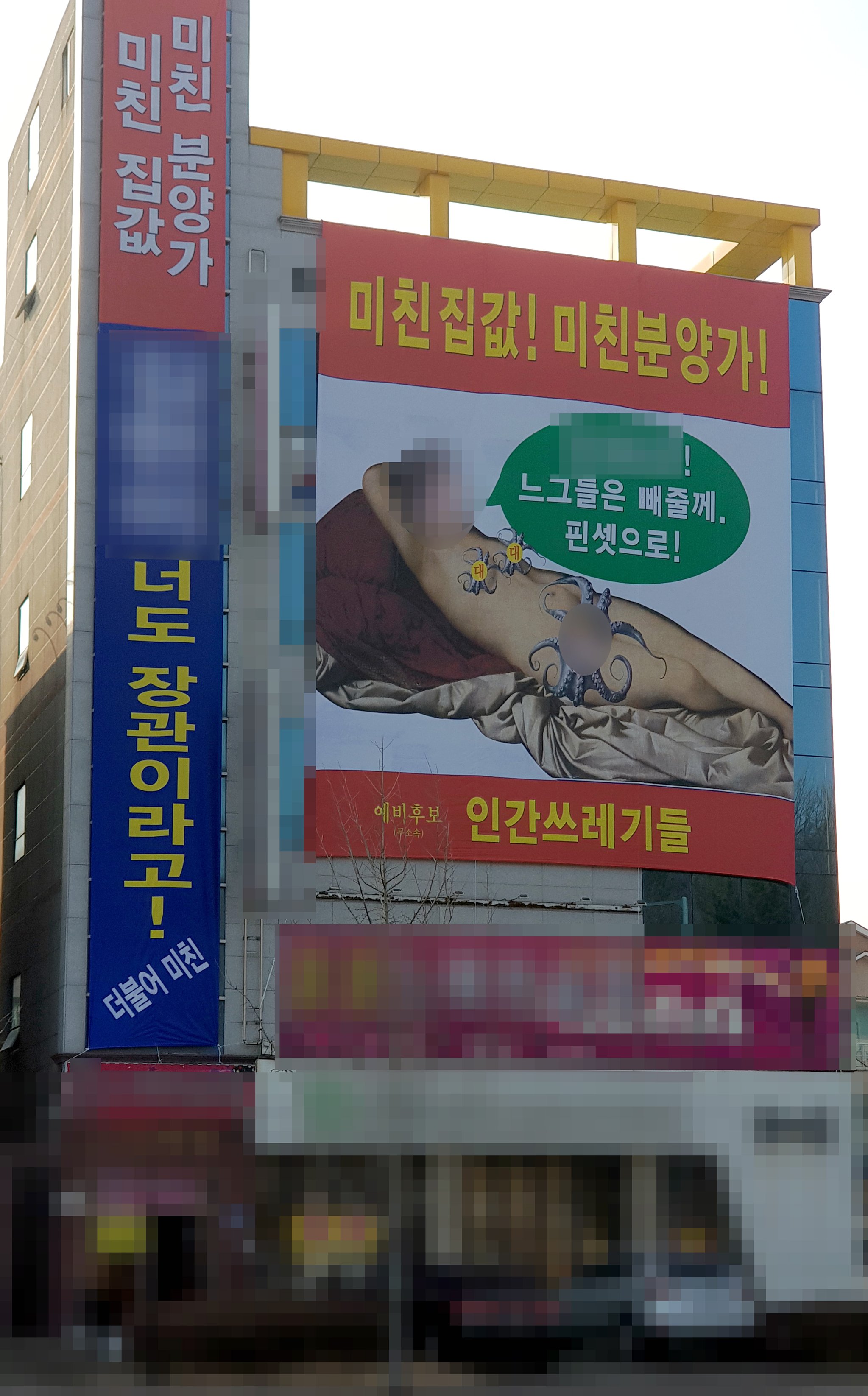 A씨가 2층부터 6층까지 세로로 내건 현수막에는 ‘미친 집값, 미친 분양가’, ‘xxx 너도 장관이라고! 더불어 미친!’, ‘예비후보 인간쓰레기들’ 등의 자극적인 문구가 적혀있고, 3층부터 5층을 뒤덮은 정사각형 현수막에는 여성의 나체에 김현미 국토교통부 장관의 얼굴을, 특정 신체부위에 이용섭 광주시장의 얼굴을 합성했다.