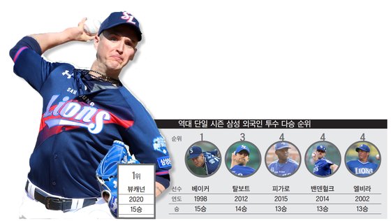 뷰캐넌은 지난 16일 대전 한화전에서 시즌 15승째를 따냈다. 삼성 외국인 투수가 단일 시즌 15승을 달성한 건 1998년 스콧 베이커 이후 22년 만이었다. 발비노 갈베스(10승), 나르시소 엘비라(13승), 릭 밴덴헐크(13승)를 비롯한 쟁쟁한 투수들이 베이커 기록(15승)에 도전했지만, 역부족이었다. 뷰캐넌은 추가 등판이 가능해 삼성 외국인 투수로는 사상 첫 16승에 도전할 수 있었다. 그러나 몸 상태 등을 고려해 한화전을 끝으로 시즌을 마감했다. 포스트시즌 진출에 실패한 삼성으로선 뷰캐넌을 무리시킬 필요가 없었다.