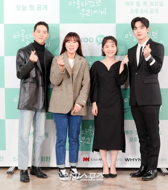 배우 여회현(왼쪽부터), 서민정 PD, 소주연, 김요한이 28일 오후 온라인 생중계로 진행된 카카오TV 오리지널 드라마 '아름다웠던 우리에게' 제작발표회에 참석해 포토타임을 갖고 있다.