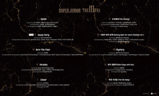 그중 1번 트랙인 ‘SUPER’는 파워풀한 베이스 사운드와 트렌디한 신스 사운드에 슈퍼주니어만의 에너지가 더해진 곡으로, 강렬한 존재감을 나타낸다. 가사에는 흩어졌던 별들이 다시 모여 또 한 번 마음을 훔쳐내겠다는 당당한 포부를 담았다. 또한 수록곡 ‘Paradox’는 멀어지려 할수록 가까이 빠져드는 마음을 ‘역설’에 빗대어 풀어냈고, 강렬한 비트에 속삭이듯 표현된 보컬로 높은 중독성을 자랑한다.