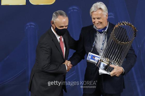 지난해 10월 28일(한국시간) 롭 만프레드 MLB 커미셔너(좌)가 마크 월터 LA 다저스 구단주(우)에게 트로피를 전해주고 있다. 사진=게티이미지 미국 메이저리그(MLB)의 롭 만프레드 커미셔너가 향후 있을 리그 확장 문제를 언급했다.