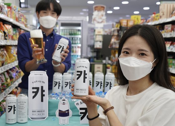 세븐일레븐에서 모델들이 '배달의민족'과 손잡고 만든 '캬 소리나는 맥주(캬 맥주)'를 소개하고 있다. 세븐일레븐 제공 세븐일레븐은 지난 28일 배달의민족과 손잡고 라거타입수제 맥주 ‘캬 소리 나는 맥주(수제 맥주 캬)’를 출시했다. 제품명은 시원한 맥주를 처음 마셨을 때 외쳐지는 일상 속 구어 “카”에서 따온 말이다.