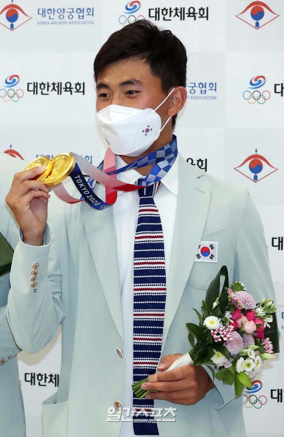 [포토]양궁대표팀 김제덕, 금메달 두 개 들고 '미소'