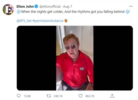 지난 7일 전 세계적인 팝스타 엘튼 존(Elton John)이 자신의 SNS 계정에 방탄소년단의 '퍼미션 투 댄스'(Permission to dance)를 따라부르는 영상을 올렸다. 앞서 방탄소년단은 '퍼미션 투 댄스'에서 '모든 게 틀렸다고 느껴질 때는 엘튼 존의 노래를 부르자'라며 엘튼 존에게 존경의 뜻을 내비친 바 있다.