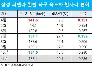 대부분의 선수가 후반기 어려움을 겪는다. 체력 소모가 누적되기 때문이다. 올 시즌 4월과 10월 리그 평균 타구 속도를 비교하면 3.4㎞/h가 느려졌다. 그런데 피렐라는 이 차이가 무려 7㎞/h나 된다. 리그 평균을 훨씬 상회한다. '총알 타구'가 사라진 건 발바닥 부상과 연관이 있다. 평발인 피렐라는 족저근막염(plantar fasciitis)이 심하다. 족저근막염은 발바닥 근육을 감싸고 있는 막에 생긴 염증인데 경기력과 직결된다. 허삼염 삼성 감독은 "(타석에서) 영향이 없다고 볼 수 없다. 타격할 때 지면에 대한 반발력이나 일체감을 느끼지 못해 상체 위주의 스윙이 연결되지 않았나 싶다. 그래서 타격 지표가 하락세에 접어들었다"고 말했다.