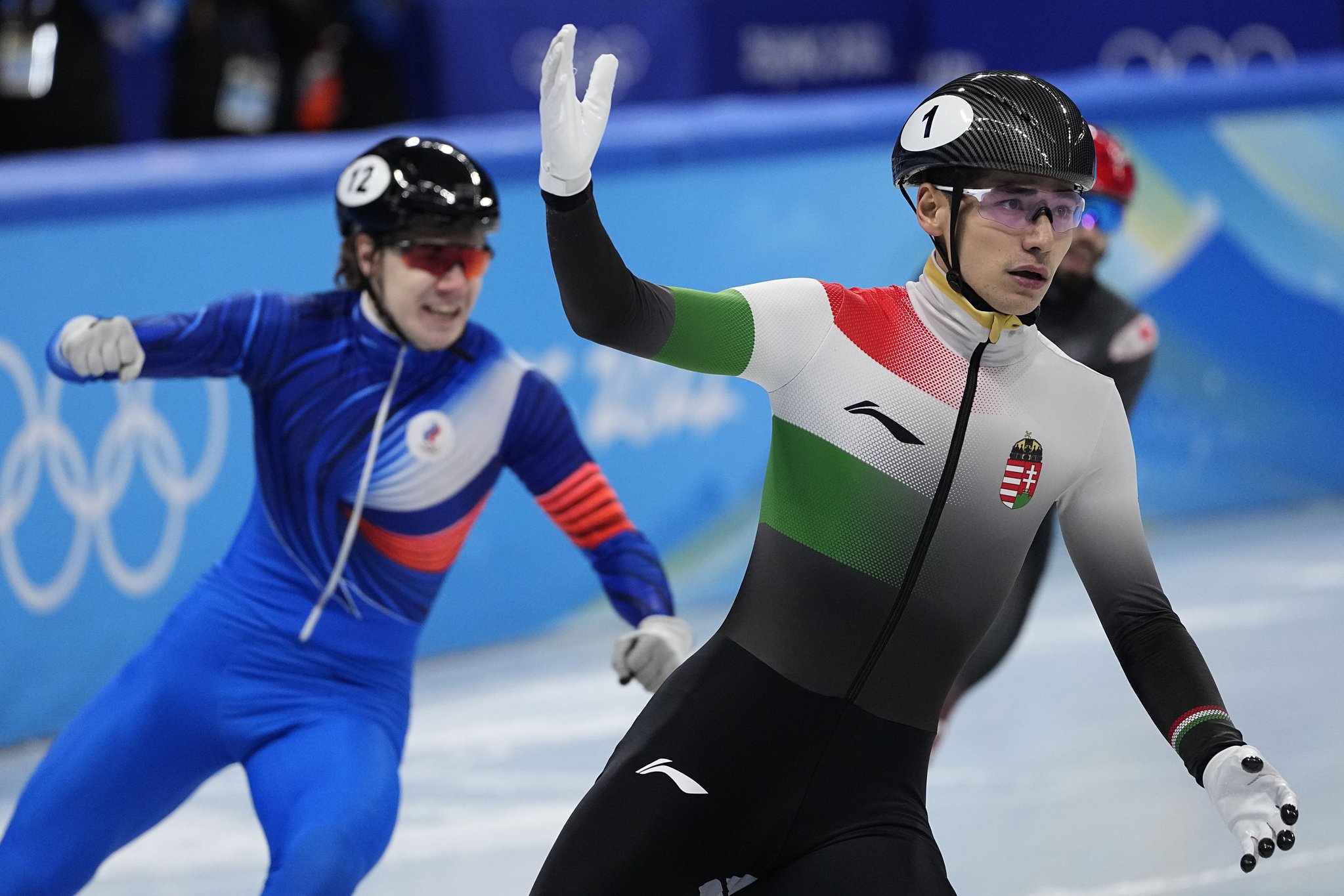 결승선을 통과하는 류 사오앙(오른쪽). [AP=연합뉴스] 헝가리 쇼트트랙 대표팀 류 사오앙(24)이 2022 베이징 동계올림픽에서 첫 금메달을 획득했다.