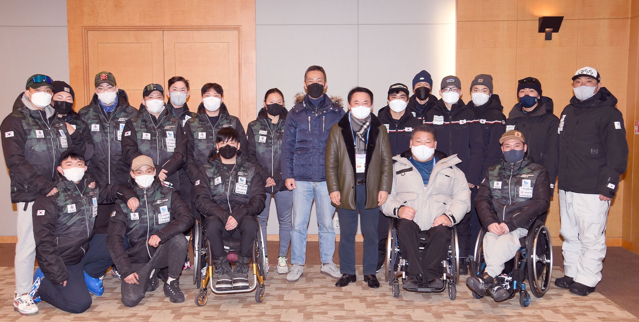 2022 베이징 동계패럴림픽대회 윤경선 선수단장(가운데)과 알파인스키 및 스노보드 선수단이 기념사진을 찍고 있다. [사진 대한장애인체육회] 한편 2022 베이징 동계패럴림픽대회 윤경선 선수단장은 국가대표 알파인스키 및 스노보드 선수단 격려를 위해 횡성을 방문했다.
