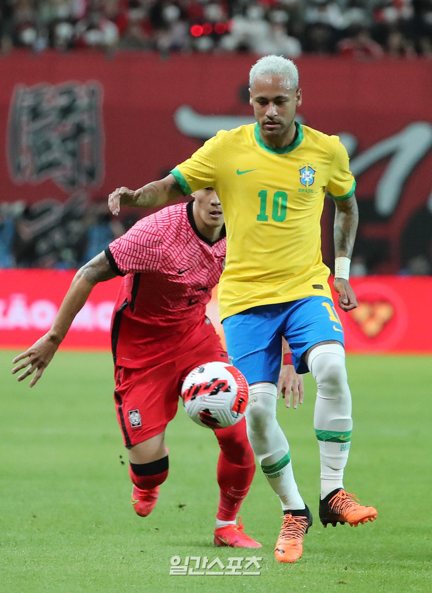 대한민국 축구대표팀과 브라질 대표팀의 친선경기가 2일 오후 서울 상암동 서울월드컵경기장에서 열렸다. 네이마르가 여유있게 수비를 따돌리고 있다. 상암=김민규 기자 브라질 축구대표팀 공격수 네이마르(30·파리 생제르맹)가 올해 대표팀 유니폼을 벗을까.