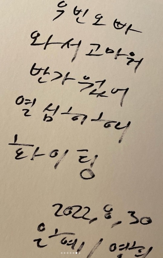 공개된 사진에서 김우빈은 정은혜의 개인전시회를 찾아 우정을 과시했다. 두 사람은 '우리들의 블루스'에 함께 출연했다. 특히 정은혜는 김우빈의 방문에 고마움을 담아 "우빈 오빠 와서 고마워. 반가웠어. 열심히 해. 파이팅"이라는 사인을 남겼다.