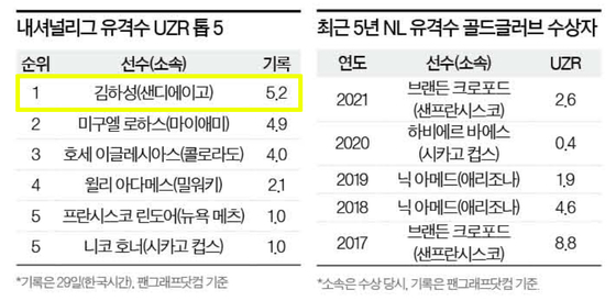 MLB 기록 전문 사이트 팬그래프닷컴에 따르면, 김하성의 UZR(Ultimate Zone Rating)은 29일(한국시간) 기준 5.2로 내셔널리그(NL) 유격수 중 1위다. NL 전체 야수를 통틀어도 무키 베츠(LA 다저스 외야수·11.8) 놀란 아레나도(세인트루이스 카디널스 3루수·8.4) 브랜든 로저스(콜로라도 2루수·5.6)에 이은 4위. 지난해 NL 유격수 부문 골드글러브(GG)를 받은 브랜든 크로포드(샌프란시스코 자이언츠)의 UZR이 2.6이었다는 걸 고려하면 김하성의 수비 지표는 압도적이다. 크로포드의 올 시즌 UZR은 –2.7로 리그 11위다.