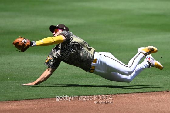 김하성은 올 시즌 그림 같은 다이빙 캐치로 현지 해설을 놀라게 만들고 있다. 게티이미지 샌디에이고는 주전 유격수 페르난도 타티스 주니어의 실책이 지난해 NL 유격수 중 최다(21개)였다. 화려한 공격 이면엔 부실한 수비가 있었다. UZR이 –7.5일 정도로 수비가 형편없었다. 타티스 주니어는 지난 13일 경기력 향상 물질 클로스테볼 양성 반응을 보여 80경기 출전 정지 처분을 받아 시즌 아웃됐다.