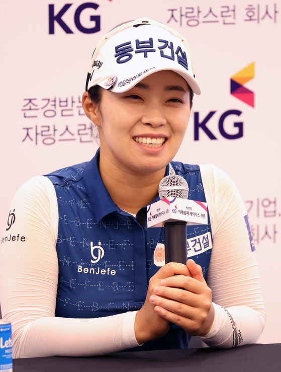 김수지가 1라운드를 마치고 미디어센터에서 취재진의 질문에 답하고 있다. 이데일리 스타in 노진환 기자 김수지는 2017년 첫 출전 대회를 제외하고 KG·이데일리 레이디스 오픈에서 톱10에 꾸준히 이름을 올리고 있다. 코스와 궁합이 좋고 최근 샷감·퍼트감 등이 많이 올라왔기 때문에 2연패 가능성을 높이고 있다.