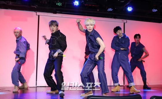 그룹 에이블루가 24일 오후 서울 마포구 윤형빈 소극장에서 진행된 보이그룹 ‘에이블루’의 데뷔 앨범 '컬러_더 스타트(Color_the start)' 발매 기념 쇼케이스에 참석해 타이틀곡 '카니발' 무대를 선보이고 있다.