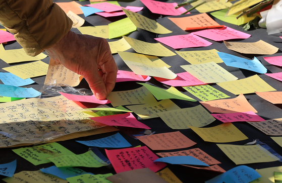 2일 서울 용산구 이태원역 1번 출구 앞 참사 추모 공간을 찾은 시민이 추모 메세지를 붙이고 있다. 연합뉴스 SK텔레콤은 행정안전부 요청으로 참사 당일인 지난달 29일 밤의 이태원 주변 유동인구 자료를 전달한 것으로 전해졌다.