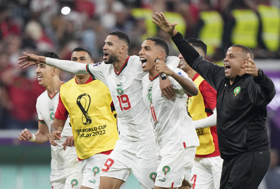 2022 카타르 월드컵 조별리그 F조 최종전에서 캐나다를 꺾은 모로코 선수들이 환호하는 모습. AP=연합뉴스 이번 카타르 월드컵에서 약체로 평가받던 피파랭킹 22위 모로코가 벨기에와 크로아티아가 속한 F조에서 조 1위로 16강에 진출하는 이변을 연출했다.