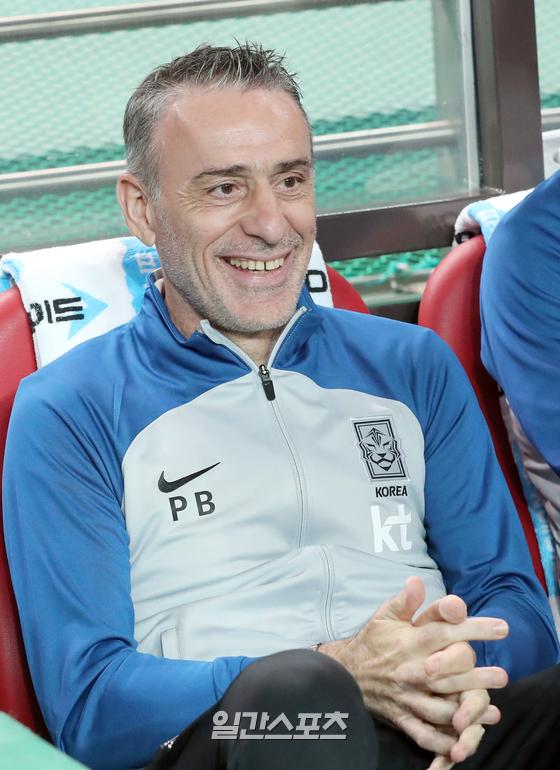 파울루 벤투 감독이 이끄는 한국 축구대표팀이 27일 오후 서울월드컵경기장에서 카메룬과 평가전을 펼쳤다. 벤투 감독이 벤치에서 활짝 웃고있다. 서울월드컵경기장=정시종 기자 capa@edaily.co.kr /2022.09.27. 파울루 벤투 축구대표팀 감독이 지휘봉을 내려놓는다.