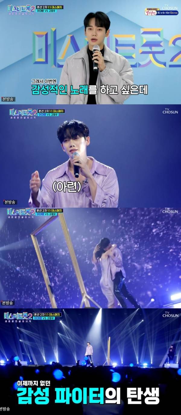 이날 이대원은 고정우를 상대로 지목해 선공에 나섰다. 연보랏빛 블라우스를 입고 촉촉히 젖은 듯한 헤어스타일을 연출한 그는 즉각 감정에 몰입해 채은옥의 '빗물'을 아련한 감성으로 불렀다. 특히 자신의 장기인 '퍼포먼스'도 빼놓지 않았는데, 무대 중간에 한 여성과 '거울' 퍼포먼스를 선보여 소름을 안겼다. 아픈 이별의 감정을 온몸으로 표현하는 스토리텔링을 완벽하게 표현한 것.