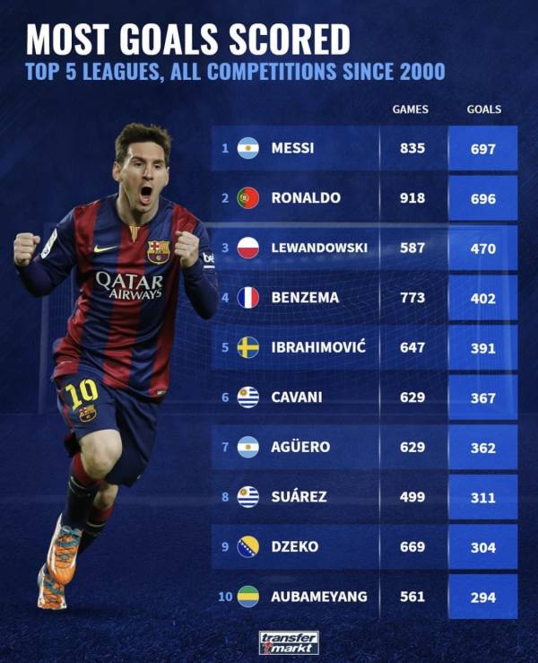 축구 이적 전문 사이트 트랜스퍼마르크트는 3일(한국시간) 2000년 이후 5대 리그(영국·프랑스·독일·스페인·이탈리아)에서 가장 많은 골을 넣은 선수 톱10을 공개했다. 리그뿐만 아니라 모든 대회를 포함한 득점 기록으로 순위를 가렸다.