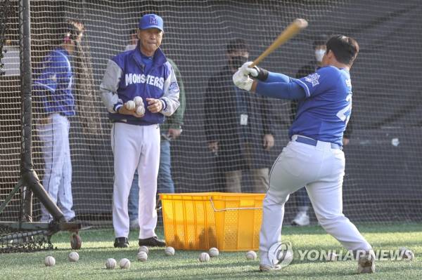 박찬희의 타격을 지도하는 김성근 감독(왼쪽). 연합뉴스