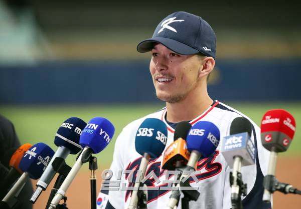2023 월드베이스볼클래식(WBC)에 출전하는 대한민국 야구대표팀 토미 현수 에드먼이 2일 오후 서울 구로구 고척스카이돔에서 진행한 훈련을 마치고 취재진과 인터뷰를 하고 있다. 고척=김민규 기자 mgkim1@edaily.co.kr