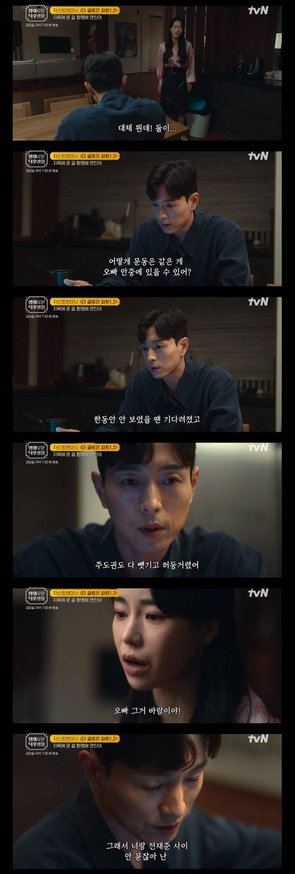 그러자 박연진은 “오빠 그거 바람이야. 아무리 포장에도 그거 바람이야”라고 쏘아붙였고, 하도영은 “네가 그러니까 억울하긴 한데 불만 없어. 그래서 너랑 전재준(박성훈) 사이 안 묻잖아”라고 말해 박연진을 당황시켰다. 극중 박연진과 전재준은 오랜 불륜 관계를 이어온 사이다.