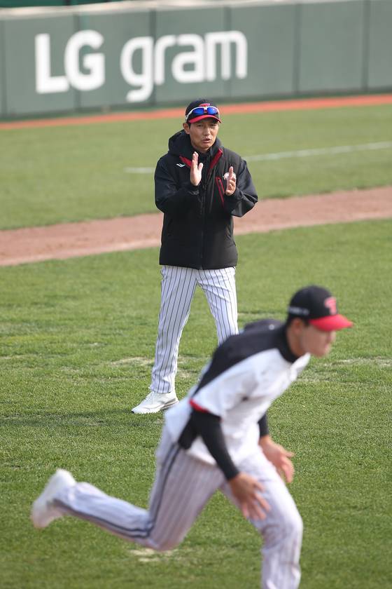염경엽 LG 트윈스 감독이 이천챔피언스파크에서 선수단 훈련을 지켜보고 있다. LG는 시범경기에서 압도적인 팀 도루를 기록, 뛰는 야구를 예고하고 있다. LG 제공