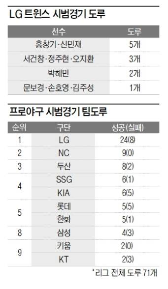 문보경과 손호영을 비롯해 9명의 선수가 도루를 기록했다. 지난 18일 사직 롯데 자이언츠전에선 7명의 선수가 도루 7개를 합작하기도 했다. 4회를 제외한 매 이닝, 타순을 가리지 않고 주자들이 뛰었다. 염경엽 감독은 "전체가 다 움직일 수 있다. 한 베이스를 더 가려고 노력하고 있다"며 "스프링캠프에서 연습했지만 짧은 시간 안에 선수들이 너무 잘 적응하고 있다"고 흡족해했다. LG 홍창기와 신민재가 시범경기 공동 도루 1위(5개)다.