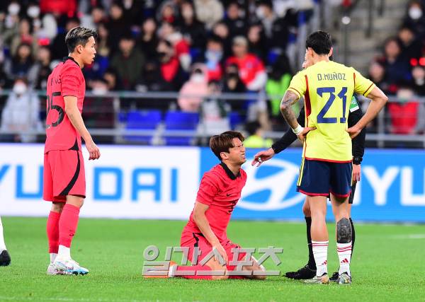 위르겐 클린스만 감독이 이끄는 축구국가대표팀이 24일 오후 울산문수월드컵경기장에서 콜롬비아와 경기를 펼쳤다. 경기중 부상한 김진수가 고통스러워 하고있다. 울산=정시종 기자 capa@edaily.co.kr /2023.03.24.