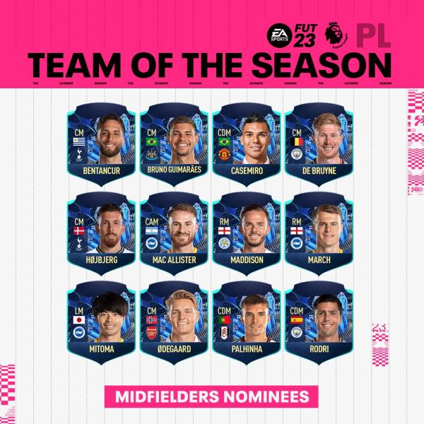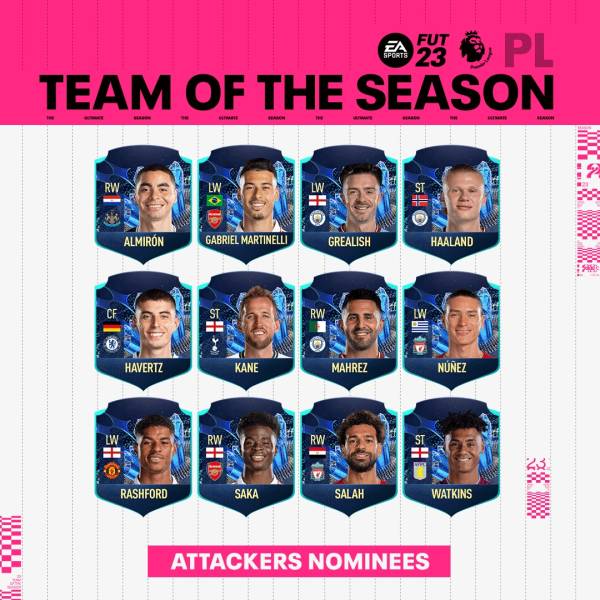 EA SPORTS FIFA는 18일(한국시간) 공식 홈페이지를 통해 2022~23시즌 EPL 올해의 팀(Team of the Season) 후보를 공개했다. 공격수와 미드필더는 각각 12명, 수비수는 11명, 골키퍼는 5명이 후보에 올랐다.