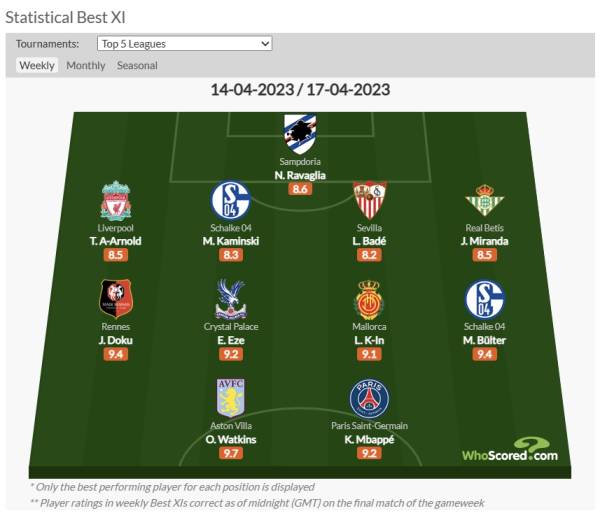 후스코어드는 4워 14일부터 17일까지 진행된 유럽 5대리그 경기를 기준으로 가장 평점이 높았던 선수들을 포지션별로 뽑아 알렸다. 유럽 5대리그는 스페인, 잉글랜드, 이탈리아, 독일, 프랑스다.