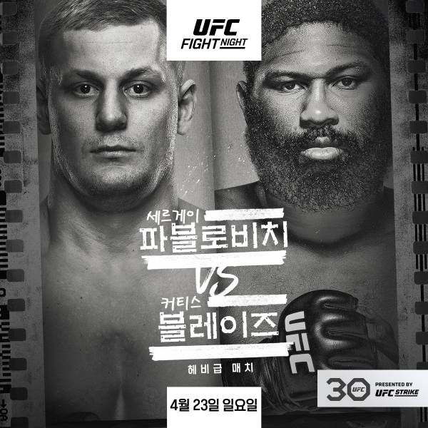 UFC 파이트 나이트: 파블로비치 vs 블레이즈 메인카드는 오는 4월 23일(일) 오전 8시부터 TVING과 tvN SPORTS를 통해 생중계된다.