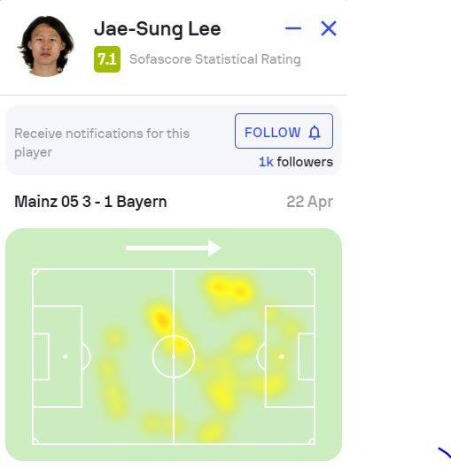 이날 이재성은 3-4-2-1 포메이션에서 원톱 뤼도비크 아조르크 바로 밑에서 활약했다. 여느 때와 같이 활발했다. 그는 후방부터 전방, 측면 할 것 없이 곳곳에 발 도장을 찍었다. 히트맵을 보면 이재성의 진가가 고스란히 드러난다. 뮌헨전 이재성의 히트맵. 경기장 곳곳에 이재성의 흔적이 남아있다.(사진=소파 스코어) 공격포인트를 기록하진 못했으나 승리에 혁혁한 공을 세웠다. 이재성은 팀이 0-1로 뒤진 후반 20분, 뮌헨 수비수가 크로스를 머리로 걷어낸 것을 이재성이 페널티 지역 정면에서 오른발 발리슛으로 연결됐다. 슈팅이 골키퍼에게 막혔으나 문전에 있던 뤼도비크가 머리로 밀어 넣었다.