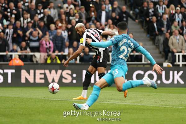 뉴캐슬 조엘링톤이 23일 토트넘과의 홈경기에서 슈팅을 시도하고 있다. 사진=게티이미지 이어 2분 만에 격차가 5골로 더 벌어졌다. 오른쪽 측면에서 간결하게 전개된 뉴캐슬 공격에 토트넘 수비는 아무런 방어도 하지 못했다. 션 롱스태프의 컷백을 이사크가 또다시 마무리했다. 전반전이 절반도 채 되지 않은 시점에 스코어는 0-5가 됐다. 이는 지난 2019년 9월 맨체스터 시티가 왓포드를 상대로 전반 18분 만에 5-0으로 만든 이후 EPL 역사상 두 번째로 빠른 기록이다.