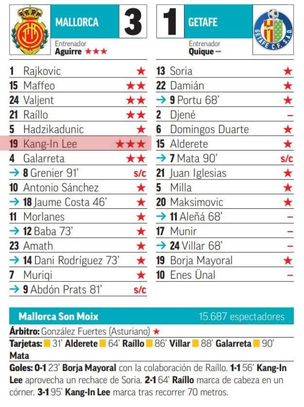 또 풋볼데스데마요르카 역시 “이강인의 동점골은 경기 분위기 자체를 바꿨다. 추가시간엔 80m를 달려 3-1 승리를 이끄는 골까지 터뜨렸다. 이보다 더 좋은 에필로그는 없을 것”이라고 극찬했다. 매체 역시 이강인에게 평점 3점을 줬다. 만점을 받은 건 이강인 단 한 명뿐이었다.