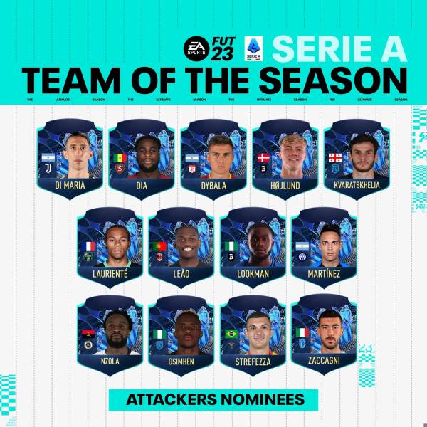 세리에 A 사무국은 16일(한국시간) 공식 채널을 통해 2022~23시즌 올해의 팀의 포지션별 후보 45인을 공개했다. 공격수 13명, 미드필더 14명, 수비수 13명, 골키퍼 5명이 베스트11을 두고 경쟁한다.