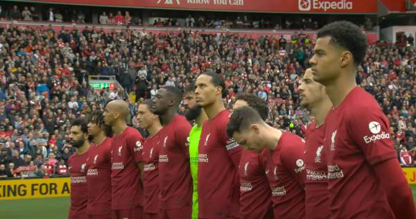 리버풀 선수들이 경기장의 센터 서클 주변에 모인 가운데 영국 국가가 나오고 있는 장면. 관중들의 야유와 함성으로 인해 경기장내에서 국가는 거의 들리지 않았다고 한다. 선수들의 침울한 표정이 인상적이다. 스카이 스포츠 캡처