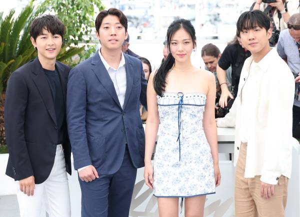 제76회 칸국제영화제 포토콜 행사에 참석한 '화란' 송중기, 김창훈 감독, 김형서,홍사빈. 사진제공=플러스엠엔터테인먼트 배우 송중기와 홍사빈, 김형서(비비) 등 영화 ‘화란’ 출연진이 칸국제영화제에서 세계 언론의 플래시 세례를 받았다.