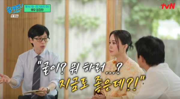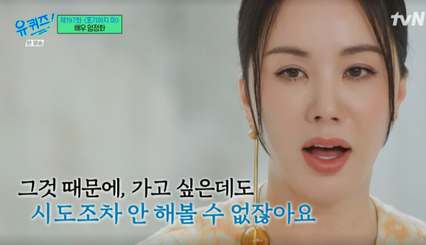 엄정화는 7일 방송된 tvN 예능프로그램 ‘유 퀴즈 온 더 블럭’(‘이하 ‘유퀴즈’)에 출연해 배우로서 데뷔 이후 10년 만에 첫 주연작인 ‘결혼은, 미친 짓이다’ 출연과 관련해 “이 작품을 하기 전에 고민을 많이 했다”며 “수위 높은 신들이 많아서 주위에서 다들 말렸다. ‘지금 높은 인기도 없어질 수 있다’ 하더라”고 말했다.
