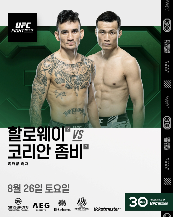 같은 날 UFC는 16일(한국시간) 공식 채널을 통해 “할로웨이와 정찬성이 8월 26일 싱가포르 대회에서 싸운다”고 발표했다. 파이트 나이트 대회이며 둘은 메인이벤트를 장식한다. 경기는 5분 5라운드로 진행된다.