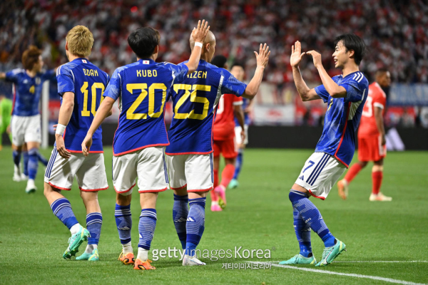 일본 공격수 마에다 다이젠(오른쪽 두 번째)이 20일 페루전에서 팀의 4번째 골을 터뜨린 뒤 동료들의 축하를 받고 있다. 사진=게티이미지일본 축구대표팀 선수들이 20일 페루전에서 골을 넣은 뒤 기뻐하고 있다. 사진=게티이미지 클린스만호의 득점력 고민과 달리 일본은 2경기 모두 다양한 루트로 다양한 선수들이 골맛을 봤다. 세트피스로 엘살바도르전 첫 골을 터뜨린 것을 시작으로 지공, 역습 등 여러 형태로 상대 골망을 흔들었다. 10골을 10명이 만들어냈다는 점도 눈에 띄는 대목이었다. 수비는 페루전 막판 실점이 옥에 티였으나 이미 4-0으로 크게 승기가 기운 시점이라 큰 의미를 두긴 어려웠다. 일본 입장에서 6월 A매치는 더할 나위 없는 성과를 이룬 평가전이 됐다.