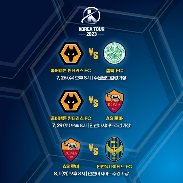지난달 11일 언터처블 스포츠 클럽(USG)은 보도자료를 통해 7월 말 3개 구단이 방한할 예정이라고 전한 바 있다. 방한 구단은 울버햄프턴(잉글랜드)·셀틱(스코틀랜드)·로마다. 이들은 인천 유나이티드와 함께 7월 26일부터 8월 1일까지 3차례 친선경기를 펼치는 것으로 알려졌다. 세 팀 모두 이번이 첫 한국 방문이었다.