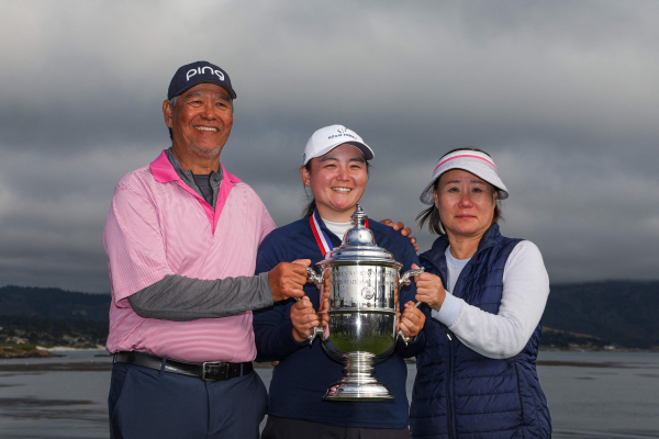 10일 US여자오픈 우승을 차지한 앨리슨 코푸즈(가운데)와 그의 가족. 그의 어머니인 메이 코푸즈(오른쪽)은 한국인이다. AFP=연합뉴스