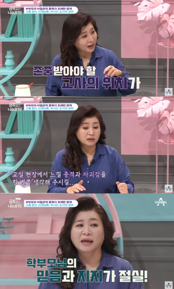 오은영 박사는 감정적인 체벌을 금지하는 것일 뿐, 언제나 엄격한 훈육을 강조해왔다. 포괄적 인권은 무엇인지, 부모와 자식, 스승과 제자 관계에 요구되는 의무와 도리를 가르쳐왔다. 또 오은영 박사는 ‘금쪽같은 내새끼’에서 “교단이 무너지기 시작하면 아이들이 학교에서 다른 사람과 어울리는 것, 질서를 지키는 것, 싫은 것도 해내는 것 등 학교에서 배우는 부분들을 못 배운다”며 학부모가 교사를 신뢰하는 것이 무엇보다 중요하다고 설파하기도 했다.